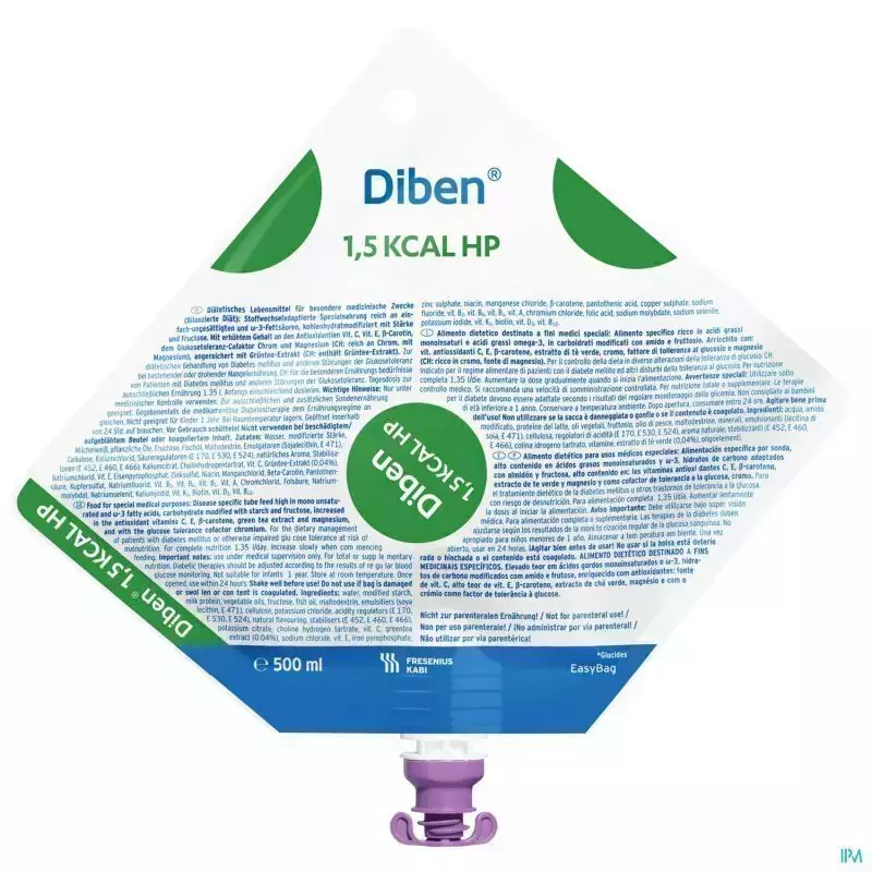 DIBEN 1.5KCAL 500ML é uma dieta enteral especialmente formulada para pacientes diabéticos, com intolerância à glicose ou resistência à insulina. Esta solução hipercalórica e hiperproteica fornece 1.500 Kcal e 75g de proteína por litro, garantindo maior aporte nutricional em menor volume.